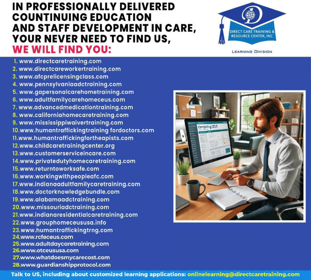 Another Blog Post by Direct Care Training & Resource Center, Inc. Photos used are designed to complement the written content. They do not imply a relationship with or endorsement by any individual nor entity and may belong to their respective copyright holders.